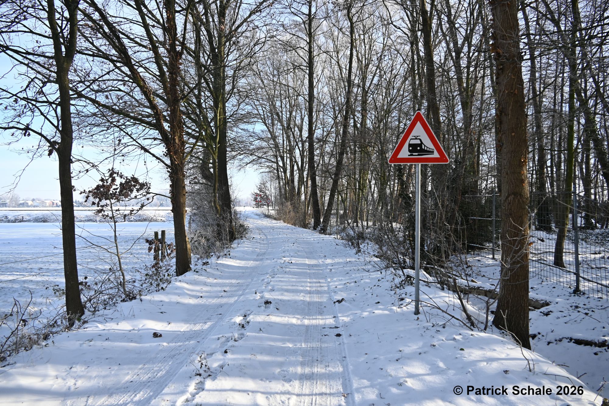 Eingeschneites Gefahrenzeichen Bahnübergang